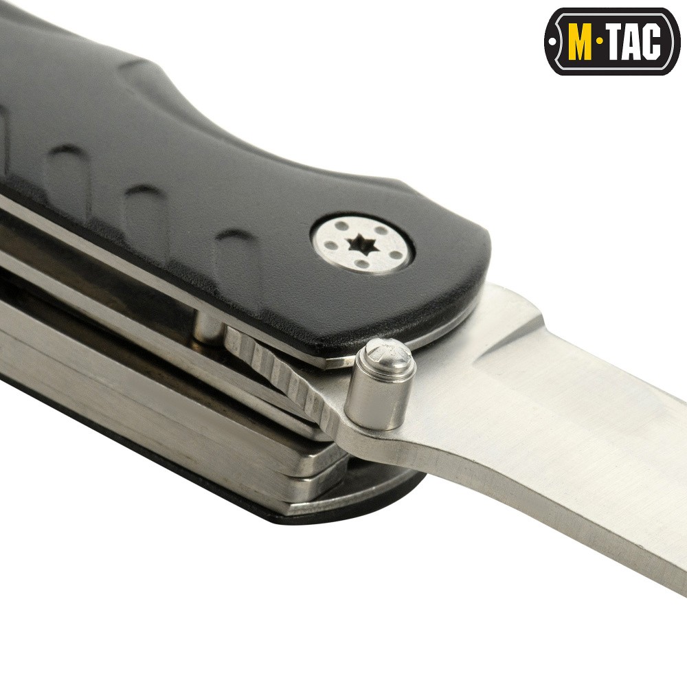 M-Tac ніж складной (5 инструм.) Steel / Black виготовлено на базі повноцінного ножа і виконаний з високоякісної нержавіючої сталі 3Cr13, містить мінімальний набір необхідних інструментів.